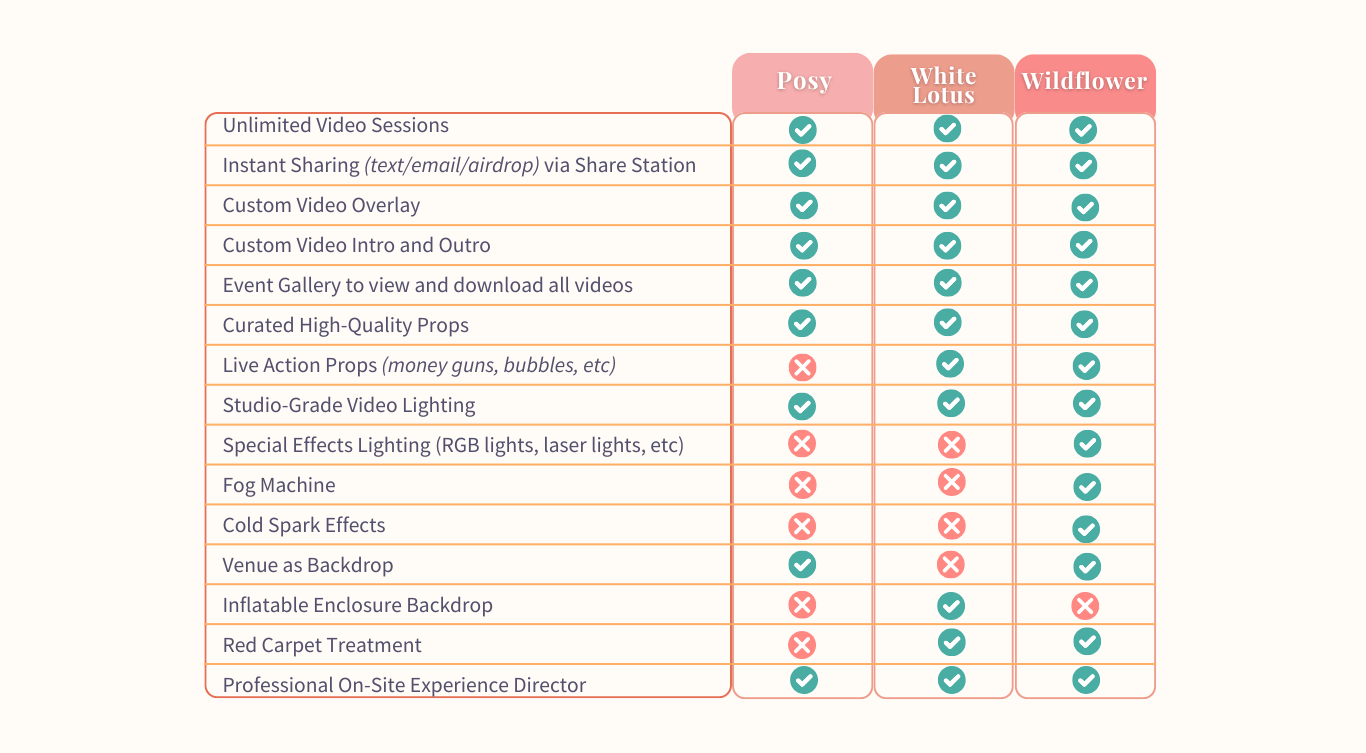 We like to think of this as The Posy Package on steroids! You get all of the amazing features of our original package, but we take it up a notch by adding in special effects lighting, a fog machine and our crowd favorite cold spark machines, which produce brilliant shooting gold (non-flammable) spark effects in every video. Throw in live-action props like money guns and bubbles, and The Wildflower Package will bring out the party animal in everyone!