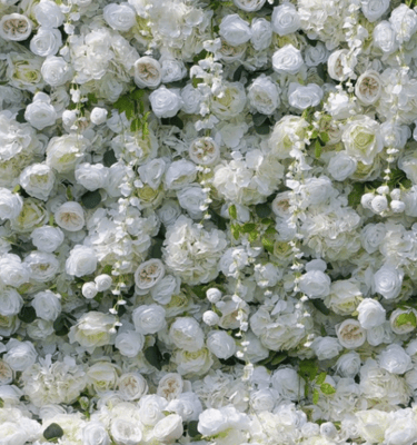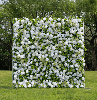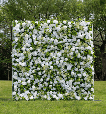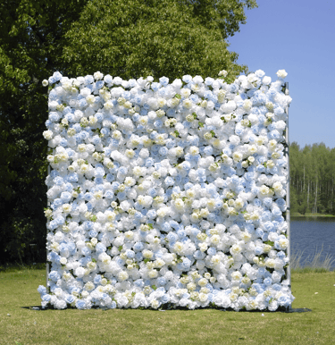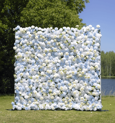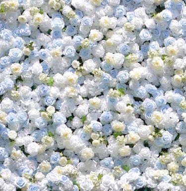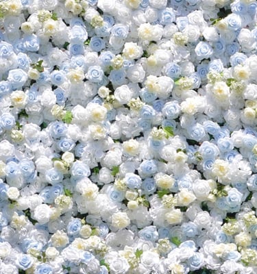 A dreamy mix of soft baby blue and crisp white roses accented with creamy ivory blooms, creating a fresh and airy backdrop perfect for romantic or whimsical settings.