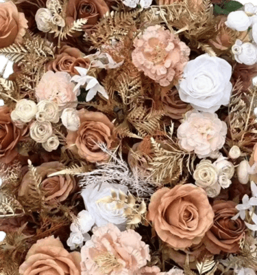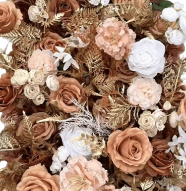 A rich blend of mocha, caramel, and champagne-toned roses paired with creamy white ranunculus, blush peonies, and soft ivory blooms. Accented with shimmering gold and bronze foliage for a warm, luxurious backdrop.