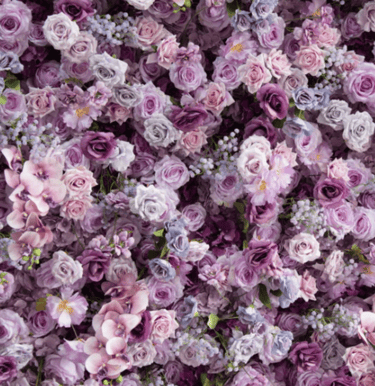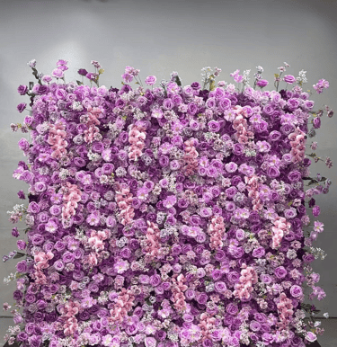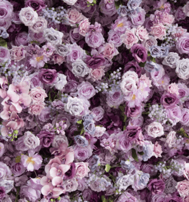 Layers of lavender, lilac, and plum-toned roses, orchids, and delicate filler blooms create a lovely lush wall with fairy-tale like charm.