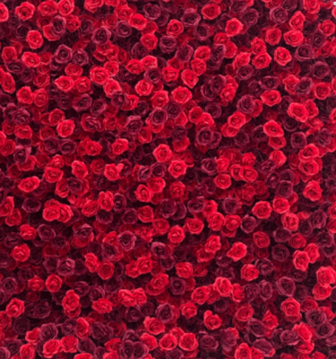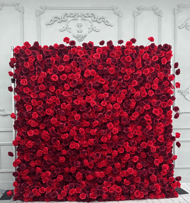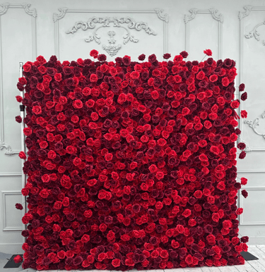 A bold and dramatic statement piece featuring densely packed crimson and deep burgundy roses for a luxurious, passionate vibe.