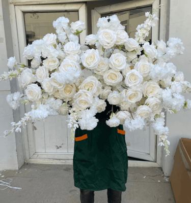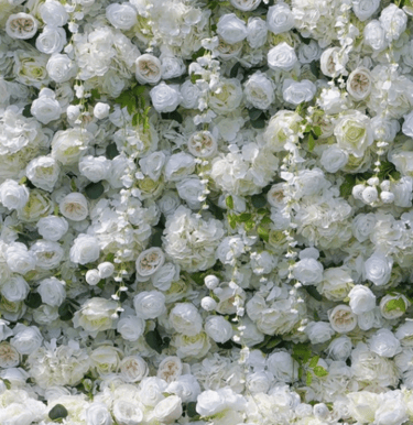 An opulent arrangement of pure white and soft ivory roses, hydrangeas, and cascading wisteria garlands for a timeless, elegant style.