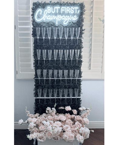 For a modern, chic aesthetic, our glossy white arch-shaped wall delivers a clean, contemporary focal point. Designed to impress, it holds 55 champagne glasses, making it ideal for large gatherings and high-end celebrations. For a dreamy look that really brings the wow factor, we include your choice of white or pink florals, or you can opt to skip the flowers and we will mount our "But First, Champagne" neon sign instead. Whether you envision romantic cascading florals or a bold, branded statement piece, we can bring your vision to life with our Sleek Champagne Wall.